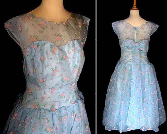 Just back from the local market where I got some newly-dug spuds and local strawberries – also, bizarrely, found a woman selling vintage clothes – now you might not think that that is unusual in itself but in the context of my local market where usually the most vintage-ish item of clothing available is a 1980’s ‘Frankie says Relax’ tshirt, it was pretty extraordinary. Got a fantastic baby blue 1950s prom dress with pink flocked (yes flocked!!) roses, starched petticoats and bow trim; a black chiffon maxi dress; and a smocked white silk 1930s nightgown – woohoo!